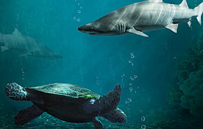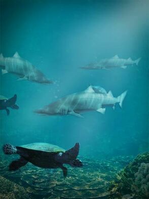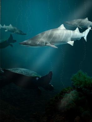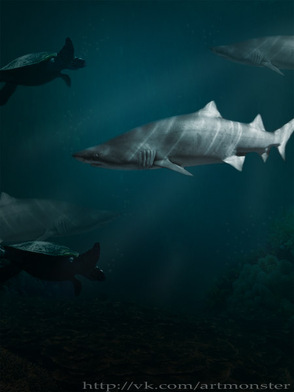 Шаг 13. Теперь, когда все акулы расположились в нужных местах, добавим им еще одного друга - черепаху. Загружаем изображение Turtle и импортируем в Фотошоп, так же, как вы делали это с акулой. Кстати, на этой фотографии черепаха плывет влево. Отразим ее по горизонтали, чтобы она плыла вправо. Используем Edit - Transform - Flip Horizontal (Изображение - Трансформация - Отразить по горизонтали).