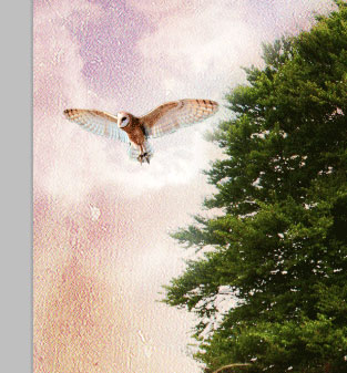 Шаг 12. Перемещаем сову на рабочий документ и используем Трансформацию (CTRL+T), чтобы откорректировать размер. Располагаем ее в верхней левой части полотна на светлом участке неба. Создаем новую группу "Совы" и перемещаем туда слой с совой.