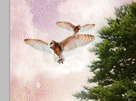Шаг 13. Дублируем (CTRL+J) слой с совой. Отражаем ее по горизотнтали Edit - Transform - Flip Horizontal (Редактирование - Трансформация - Отразить по горизонтали). Используем Трансформацию (CTRL+T), чтобы уменьшить ее размер. Убеждаемся, что дубликат слоя находится под оигиналом, и располагаем одну сову над другой.