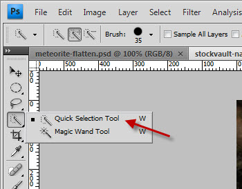 Шаг 2. Загрузите текстуру скалы, выберите инструмент Быстрое выделение (Quick Selection Tool), установите параметры размера на 35 пикселей: