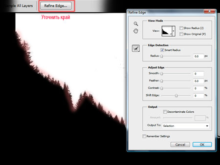После того, как участки, которые необходимо удалить, определены, нажмите клавишу «Уточнить край» (Refine Edge) в верхней панели инструментов для дальнейшего определения выделения, которое только что сделали. В программе In Adobe Photoshop CS5 есть инструмент, который называется «умный радиус» (smart radius), который автоматически аккуратно выделяет участки, которые вы хотите оставить и удалить те участки, которые выходят за линию выделения, наглядно можете посмотреть на рисунке ниже.