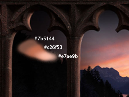 Шаг 14. В следующем шаге мы будем осветлять участки колонн. В начале, поменяйте параметры вашей кисти, выберете кисть примерно 3-5px диаметром, жёсткостью 10%, непрозрачностью 70 % и нажимом 50 %. Далее, используя номера цветовых оттенков, которые указаны ниже, начинайте по очереди осветлять участки.