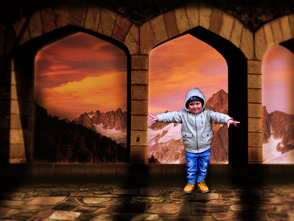 Шаг 3. Далее, откройте изображение с горами. Переместите изображение с горами на наш документ. В этом шаге, я снизил непрозрачность слоя «Колонны» так, чтобы я смог видеть и оценивать, насколько можно переместить изображение для лучшего обзора.