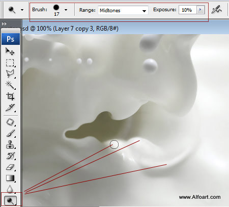(Dodge tool). Просто сделайте светлее или темнее области рядом со ртом на изображении с молоком.