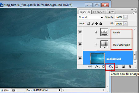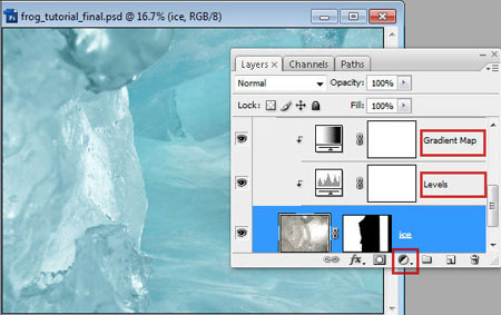 Шаг 42. Для погружения лягушки в лед, используйте аналогичный метод. А также подкорректируйте белый фон Уровнями (Levels).