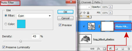 Шаг 13. Добавим голубой оттенок к черно-белому слою с лягушкой, используя корректирующий слой Фотофильтр (Photo Filter), и так же добавим обтравочную маску.
