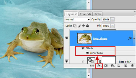 Шаг 14. Для улучшения отделённого контура лягушки, замаскируем мелкие дефекты, добавив в стилях слоя Внутреннее свечение (Inner glow ) со следующими настройками.