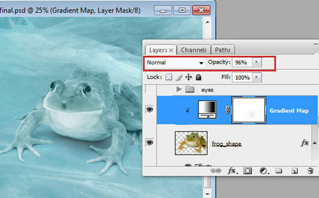 Шаг 43. Установите для этого слоя режим наложения Умножение (Multiply), чтобы скрыть белый фон, и поиграйте с непрозрачностью. Подкорректируйте слой с лягушкой при помощи корректирующего слоя Карта градиента (Gradient Map), как для синей кожи и слоя со стрекозой.