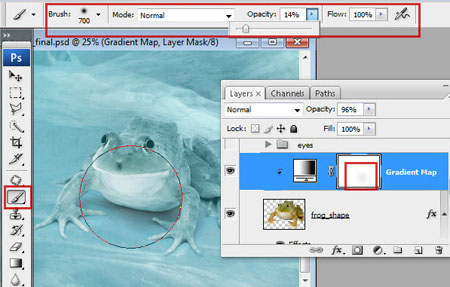 Шаг 16. Большой мягкой кисточкой коснитесь в области мордочки лягушки, стоя на маске слоя Карта градиента (Gradient Map).