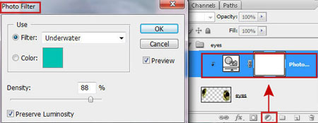 Шаг 17. Отыщите в куче ваших слоёв оригинальный слой с лягушкой, выделите глаза, скопируйте и вставьте их над слоями с синей кожей. Добавьте корректирующий слой Фотофильтр (Photo Filter)с настройкой Под водой (Underwater) и добавьте обтравочную маску.