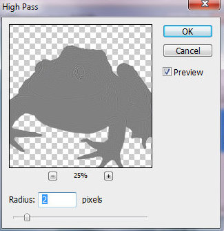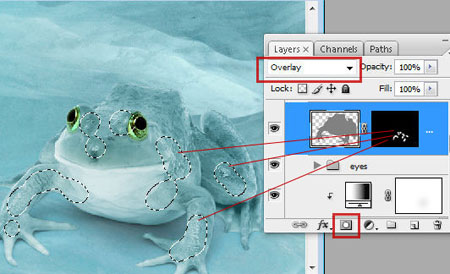 Шаг 19. Сделаем лягушку более резкой и более глянцевой. Вернитесь к слою с оригинальной лягушкой и загрузите выделение её силуэта. Чтобы загрузить выделение, вы можете использовать уже выделенную лягушку, нажав команду Ctrl + клик по миниатюре слоя с голубой кожей. Теперь с уже загруженным выделением, стоя на оригинальном слое с лягушкой, сделайте копию Ctrl +J и разместите её выше всех слоёв . Теперь идём в меню Фильтр – Другое – Цветовой контраст (Filter-Other- High Pass). Установите режим наложения для этого слоя на Перекрытие (Overlay) и добавьте маску слоя. Залейте маску чёрным цветом и мягкой белой кистью пройдитесь по областям указанным на скриншоте.