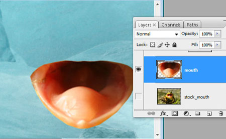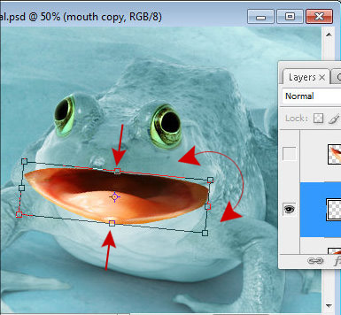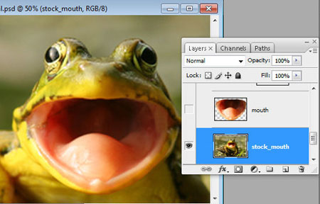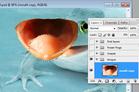 Шаг 20. Откройте изображение лягушки с открытым ртом и сотрите фон вокруг рта. Сделайте дубликат, мы будем использовать одну из копий для создания языка.