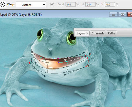 Шаг 22. Измените рот в меню Редактирование – Трансформирование –Деформация (Edit- Transform- Warp). Подкорректируйте контур рта с помощью маленькой кисточки на маске слоя или просто воспользуйтесь Ластиком