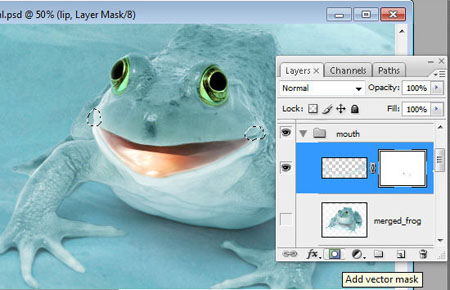 Шаг 26. Сгруппируйте все слои с лягушкой кроме рта, скопируйте группу и объедините её. Сотрите всё вокруг нижней губы и поместите этот слой выше слоя со ртом.