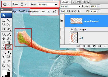 Шаг 37. Слейте все слои с языком и обработайте область отмеченную зелёным цветом инструментом Затемнитель
