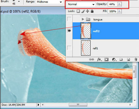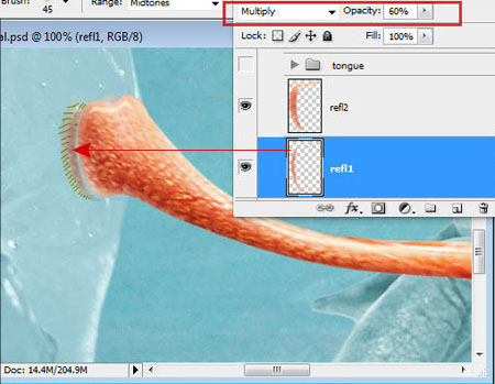 Шаг 38. Скопируйте кончик языка и вставьте его на новый слой, переместив немного влево. Загрузите выделение оригинального слоя с языком и удалите выбранную область из копии. Снова немного сместите копию, только оставьте очень небольшое пространство между языком и отражением. Уменьшите Непрозрачность (Opacity) для отражения до 44 %. Затем повторите предыдущие действия и создайте второй слой с отражением. Ему установите режим наложения Умножение (Multiply) и сотрите мягкой кисточкой подчеркнутую штриховкой область.