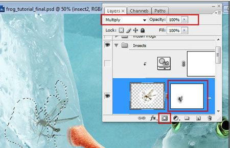 Шаг 41. Вставьте изображение с комаром и установите этому слою режим наложение Умножение (Multiply). Добавьте корректирующий слой Фото фильтр (Photo Filter) с обтравочной маской. Чтобы было впечатление того, что комар находится во льду, создайте маску и обработайте его полупрозрачной Кистью