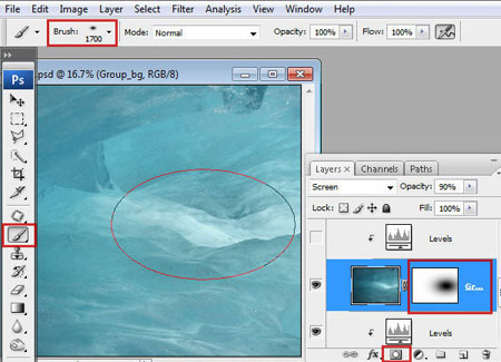 Шаг 4. Установите режим наложения для размытого слоя на Экран (Screen )и уменьшите Непрозрачность (Opacity )до90%. Добавьте к этому слою маску слоя с помощью иконки внизу палитры слоёв Добавить слой маску