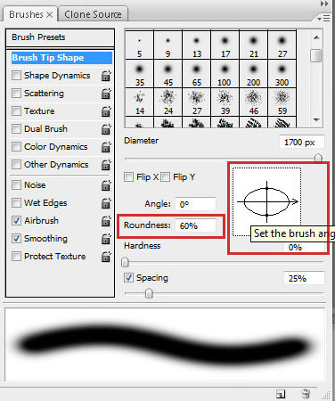 (Add Layer Mask) и прикоснитесь к ней большой мягкой кисточкой в правой части изображения. Чтобы задать для кисти форму эллипса, в Палитре настроек кисти измените настройку Формы (Roundness )в процентах.