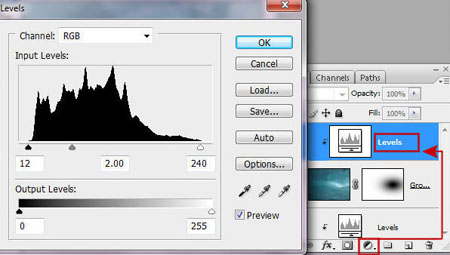 Шаг 2. Создайте два корректирующих слоя для фона, нажав на соответствующую иконку в нижнем меню палитры слоев. Выберите Цветовой тон/Насыщенность (Hue / Saturation) и Уровни (Levels). Корректирующие слои позволяют изменять свои настройки в будущем и поэтому ими пользоваться удобно. Для того, чтобы применить коррекцию только для базового слоя (фоновый слой в данном случае), нужно создать обтравочную маску (create clipping mask). Для этого выберите корректирующие слои (сделайте их активными), щелкните правой кнопкой мыши и выберите пункт Создать обтравочную маску (Create Clipping Mask). Далее примените настройки для каждого корректирующего слоя, как на скриншотах ниже.