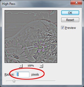 Цветы, которые находятся внутри стекла, должны быть немного размыты. Нажмите Ctrl + A чтобы выделить весь документ и перейдите в меню Редактирование – Скопировать совмещённые данные (Edit-Copy Merged) или нажмите комбинацию клавиш Ctrl + Shift + C на клавиатуре. Теперь нажмите Ctrl + V, чтобы вставить изображение на новый слой. Поместите этот новый слой поверх всех слоев и назовите его BLUR. Теперь идём в меню Фильтр – Другое – Цветовой контраст (Filter-Other-High Pass) и установите значение радиуса на 3 пикс.