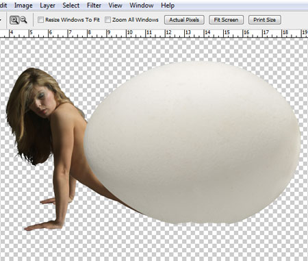 ШАГ 16. Выберите слой с моделью и активируйте свободную трансформацию Редактирование - Свободная Трансформация (Edit > Free Transform (CTRL+T) щёлкните и потяните за квадратик в углу. При этом, удерживайте клавишу SHIFT, чтобы сохранить пропорции. Чтобы выйти из режима свободной трансформации, нажмите Enter. То же самое проделайте с “яичной скорлупой”.
