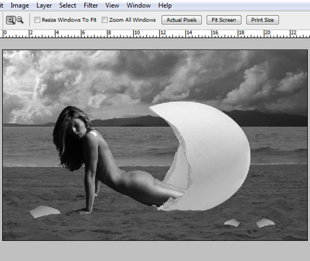 (Path Tool (P) и выделите часть яичной скорлупы. Как показано на скриншоте ниже. Копируем выделение. Возвращаемся на наш документ Окно - Untitled-1.psd (Window > Untitled-1.psd) и вклеиваем скопированное изображение. Размещаем ниже слоя “модель”. Масштабируем, как на скриншоте ниже.