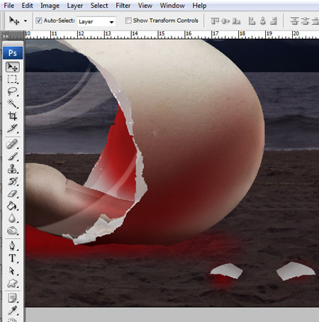 ШАГ 25. Далее, используем изображение с треснутой яичной скорлупой Окно – Stock_205___Egg_Shell_by_pink_stock.jpg (Window > Stock_205___Egg_Shell_by_pink_stock.jpg) и вырезаем кусочек скорлупы, как на скриншоте ниже. Копируем и вставляем в наш документ. Размещаем кусочек скорлупки, как на скриншоте ниже.