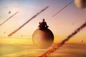 Добавим больше людей на других планетах. Находим другие стоковые изображения с людьми и повторяем весь процесс. Не забывайте, что планеты находятся на расстоянии от зрителя и они размыты, поэтому люди, сидящие на них также должны быть размыты. Вы можете просто нарисовать простой силуэт кистью и уменьшить непрозрачность слоя.