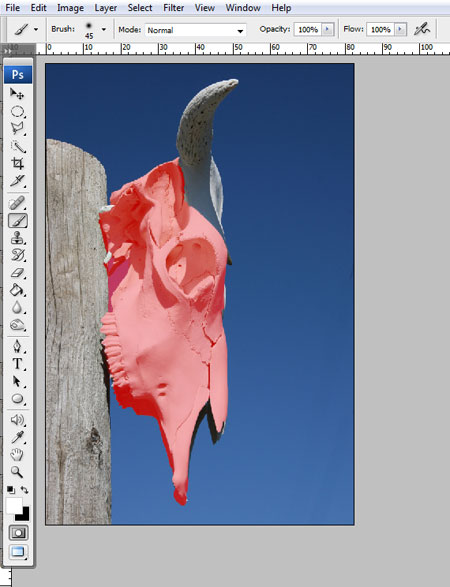 (Brush Tool (B), установите жёсткую круглую кисть и обработайте участок, окрашенный красным оттенком. Красный оттенок условно обозначает область закрашивания, не пытайтесь использовать красный цвет для закрашивания.