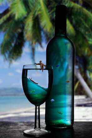 Перенесите этот слой под слой с бутылкой. Установите слою с бутылкой и бокалом режим наложения Умножение (Multiply) с непрозрачностью 100%