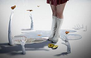 Шаг 31. Теперь мы будем добавлять руки, торчащие из поверхности, на которой стоит модель. Для начала открываем изображение девушки . Вырезаем руку и вставляем на рабочий документ.