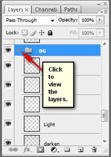 Заметка: процесс переименовывания группы такой же как и слоя.Вы заметите, что слои спрятаны, чтобы увидеть их, нажмите левой кнопкой мыши на стрелочку позади имени группы: