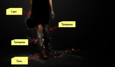 (В), чтобы нарисовать световые эффекты за шляпой, затем мягкой черной кистью добавляем теней под ногами модели, для усиления эффекта добавляем больше трещин за ногами: