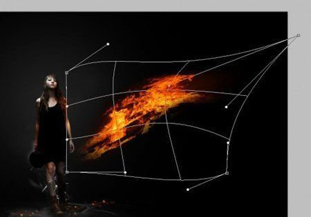 Копируем (CTRL+C) и вставляем (CTRL+V) выделенную область на рабочее полотно, располагаем новый слой под слоем с моделью, затем искажаем огонь, как показано ниже: