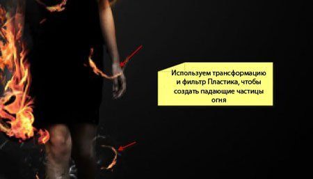 Вы можете дублировать (CTRL+J) этот огненный слой, уменьшить его и с помощью фильтра Liquify (Пластика) создать эффект падающих частиц пламени:
