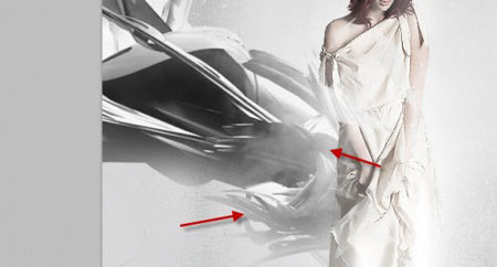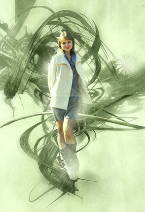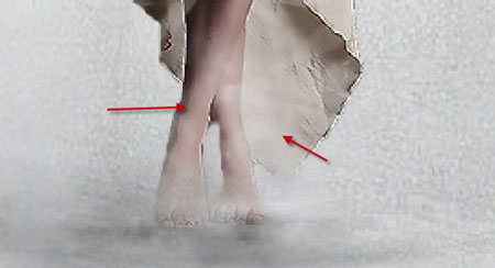 Используем кисти Volcanic, чтобы удалить часть ног модели, как показано ниже (это создаст эффект дымки). Убедитесь, что нажим и непрозрачность инструмента около 40%.