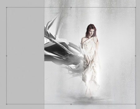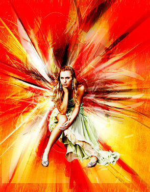 Шаг 2. Загружаем в Фотошоп фото модели, вырезаем ее и вставляем на рабочий документ. На слое с моделью используем геометрические кисти (см. урок шаг 3) в качестве ластика, чтобы удалить часть модели, как показано ниже (можете сделать это с помощью слой-маски):