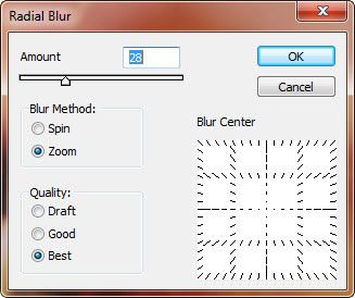 После этого объединяем все слои в один, дублируем (CTRL+J) фон и применяем фильтр Filter - Blur - Radial Blur (Фильтр - Размытие - Радиальное размытие):