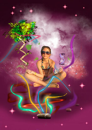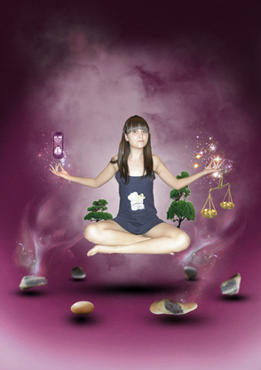 Урок графического дизайна затрагивает использование разных техник, при помощи которых можно собрать несколько графических элементов в одно гармоничное изображение. Мы создали интересный фон, используя преимущественно Кисть (Brush) (B), режимы наложения, самостоятельно сделанную кисть облаков и т.д. Мы добавили камней и листочков, обращая внимание на глубину изображения, размывая объекты фильтром Размытие по Гауссу, которые по идее отдалены от нас (Gaussian Blur). Фильтром Пластика (Liquify filter) мы создавали световые эффекты из текстур с космической туманностью, используя стоковые изображения космоса.