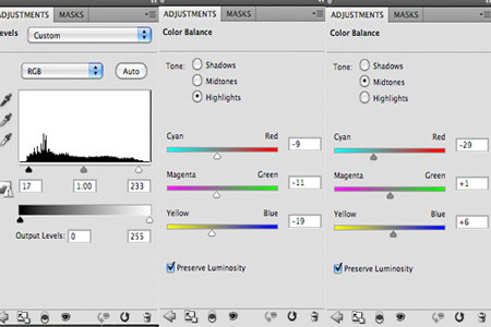 Далее, примените корректирующие слои Уровни (Level) и Цветовой баланс (Color Balance), (каждый корректирующий слой используйте в качестве обтравочных масок, таким образом, корректирующий слой будет воздействовать только на нижележащий слой, а не на всё изображение):