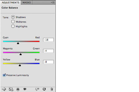 Настройки для корректирующего слоя Цветовой баланс (Color Balance):