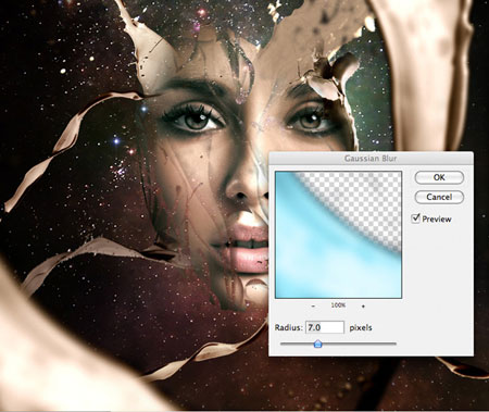 ШАГ 10. Повторите Шаг 9, добавьте ещё крупнее изображение брызг в нижней левой части документа. На этот раз примените радиус размытия 7px, чтобы этому слою придать глубину вашей композиции:
