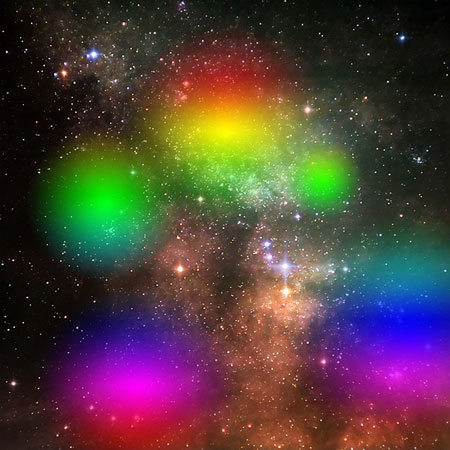 ШАГ 13. Далее, создайте новый слой, назовите этот слой цветные блики. С помощью радиального градиента, нарисуйте серию ярких бликов в цветовом диапазоне от неонового до прозрачного. Постарайтесь использовать неоновые цвета, что преобразит всё ваше изображение.