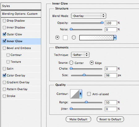 Итак, к этому слою примените стили слоя Внешнее свечение (outer glow), Внутреннее свечение (inner glow) и Наложение цвета (color overlay). Не забудьте, использовать каждый корректирующий слой в качестве обтравочной маски.