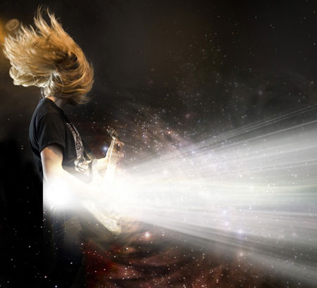 ШАГ 4. Мы хотим смягчить задний фон. Для этого, создайте новый слой, назовите его ‘осветление заднего фона’, поместив этот слой поверх слоёв Туманность / задний фон, но ниже слоя с гитаристом. С помощью инструмента Пипетка
