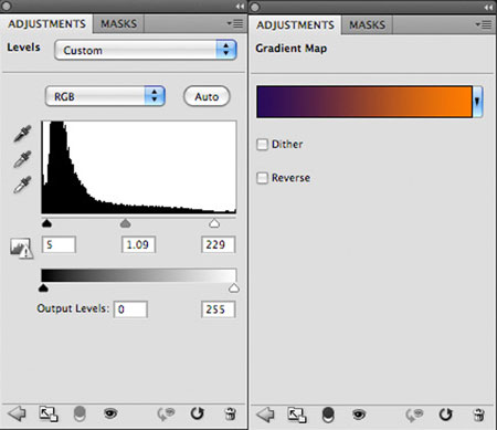 Загрузите изображение с гитаристом, переместив его в левую часть нашего документа, а затем к этому слою примените корректирующий слой Уровни (levels). Не забудьте использовать данный корректирующий слой в качестве обтравочной маски, таким образом, корректирующий слой будет воздействовать только на нижележащий слой, а не на весь документ.
