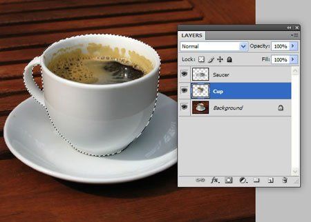 (Elliptical Marquee Tool) с растушевкой (feather) 10 пикселей выделите верхнюю часть чашки с кофе, как показано на изображении ниже.