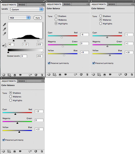 Далее, примените корректирующие слои Уровни (levels) и Цветовой баланс (color balance), каждый корректирующий слой примените в качестве обтравочной маски.