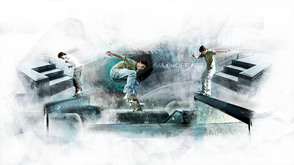 Сместите изображение с рампами в левую часть документа и примените к этому слою слой-маску, с помощью чёрной кисти и акварельных кистей из набора, скройте края изображения со скатами в стиле гранж.